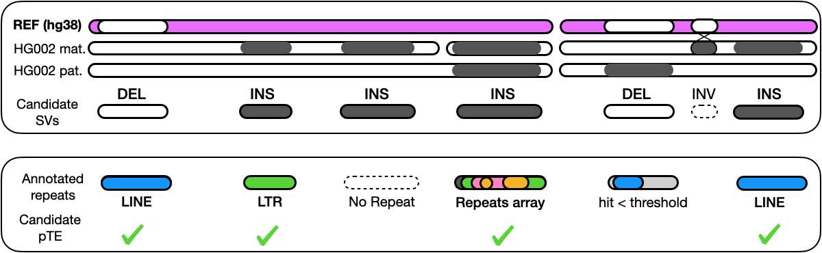 Furthermore, we need to take into account a special case for SVA elements. These elements contain a region with a variable number of tandem repeats (VNTR). Upon insertion, the VNTR region can later undergo changes in copy number, in a way comparable to microsatellites. Thus, even when a given individual is homozygous for the presence of an SVA insertion, one allele may be longer than the other due to variability in the VNTR region (see here for a clinical example). Using the --mammal argument, we asked GraffiTE to distinguish between insertion polymorphism (TE either present or absent) and VNTR polymorphism. These cases are reported with the flag mam_filter_2=VNTR_ONLY.