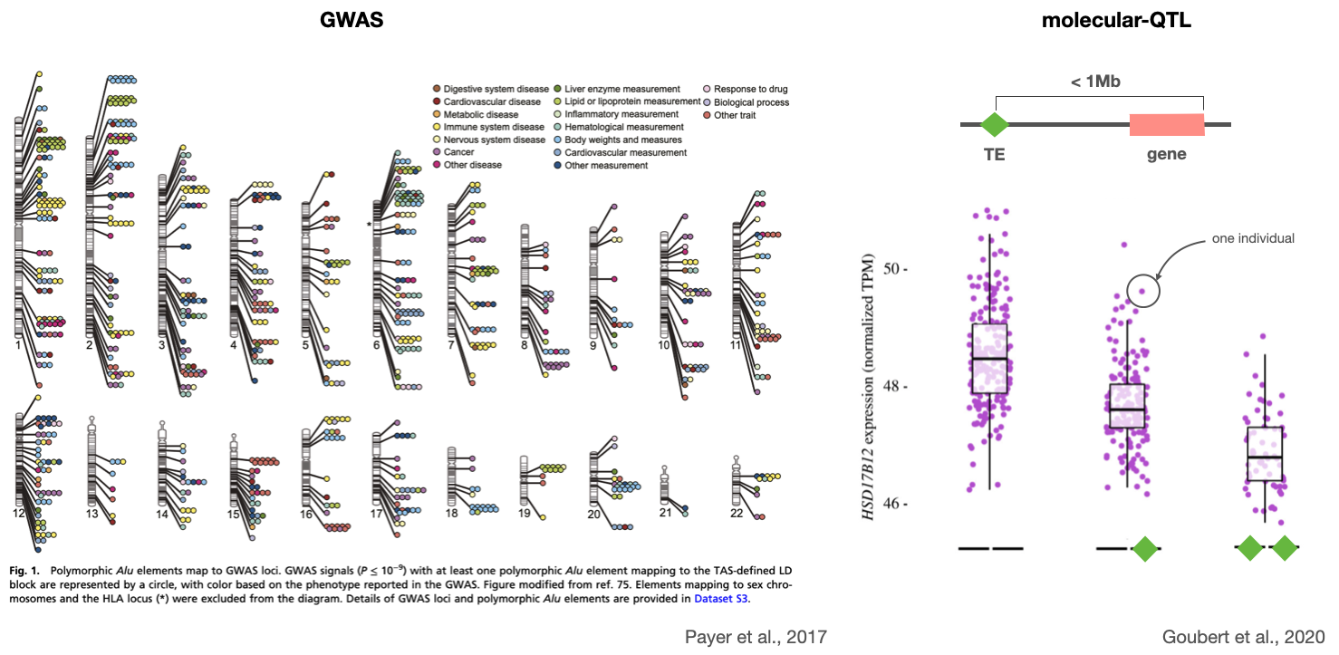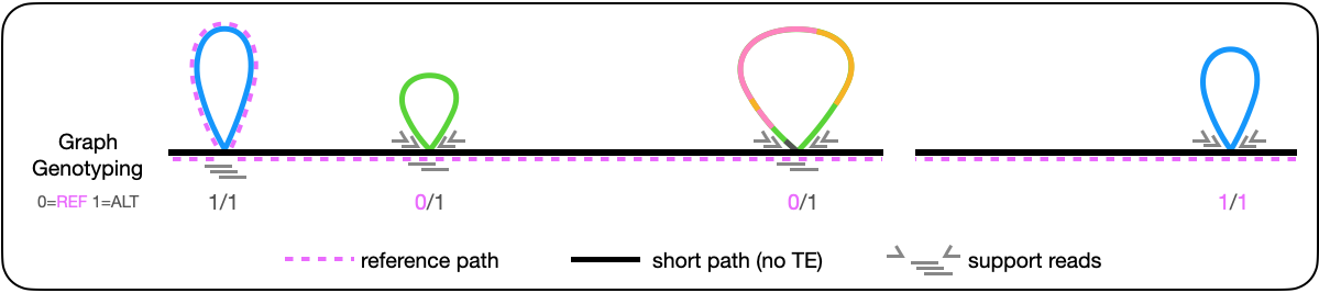 - One common limitation to most methods, is that the evaluation of the presence/absence of a TE, and their allelic state (homozygous or heterozygous) is based on mapping statistics over a reference genome, that only carries one of the two possible alleles (presence or absence of the TE). This is not only true for TEs, but it applies as well to all large (>50bp) structural variants (SV). In the recent years, pangenome-based approaches, and in particular graph-genomes allow to represent at the same time multiple alleles for a given loci. Several read mappers have been developed to be used with graph-genomes, which have dramatically increased the accuracy of SV and TE genotyping.