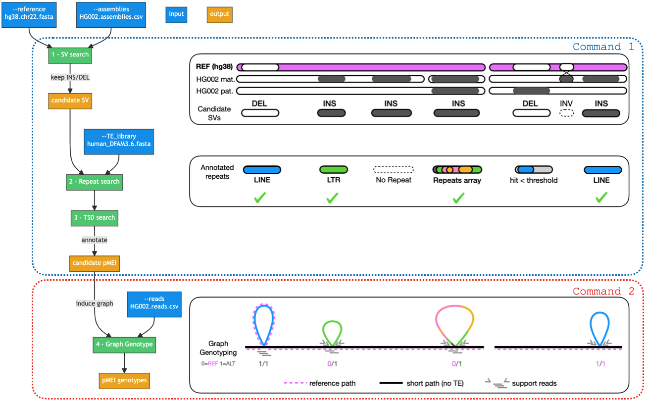 Most of these steps are automated in GraffiTE, and could be done using a single command. For clarity, we will break down the analysis in two major commands: 1) de-novo search for candidate pME and 2) graph-genotyping of each pME. Finally, we will discuss the outputs and how to interpret them.